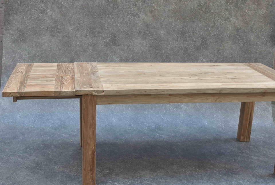 Jeder BARLI EXTENTION Tisch ist ein Unikat, geprägt von der Geschichte und dem Charakter des sorgfältig ausgewählten Altholzes Teak. Die rustikale Oberfläche mit natürlicher Maserung und Lebensspuren macht jeden Tisch zu einem einzigartigen Kunstwerk.