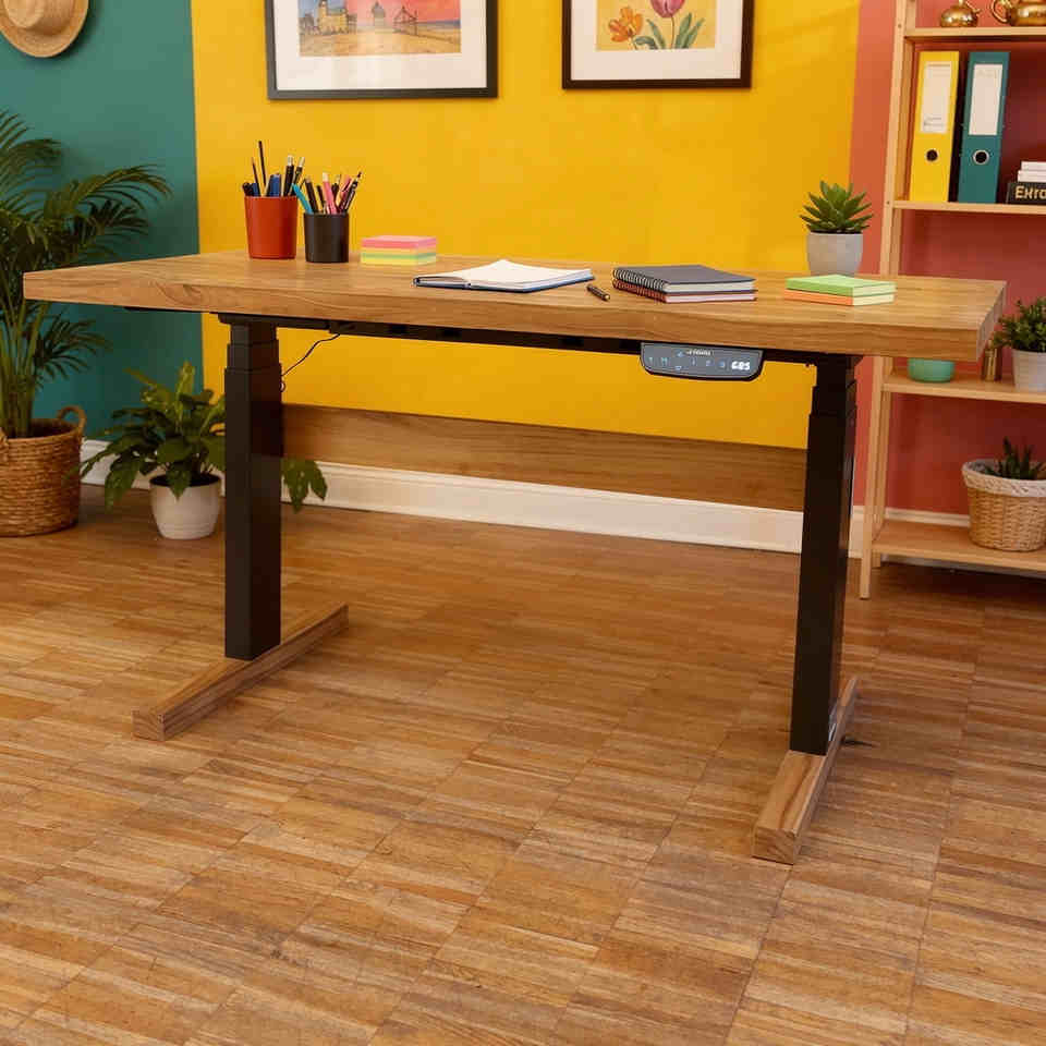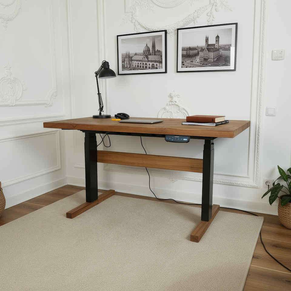 Höhenverstellbarer Schreibtisch mit Teakholz Platte