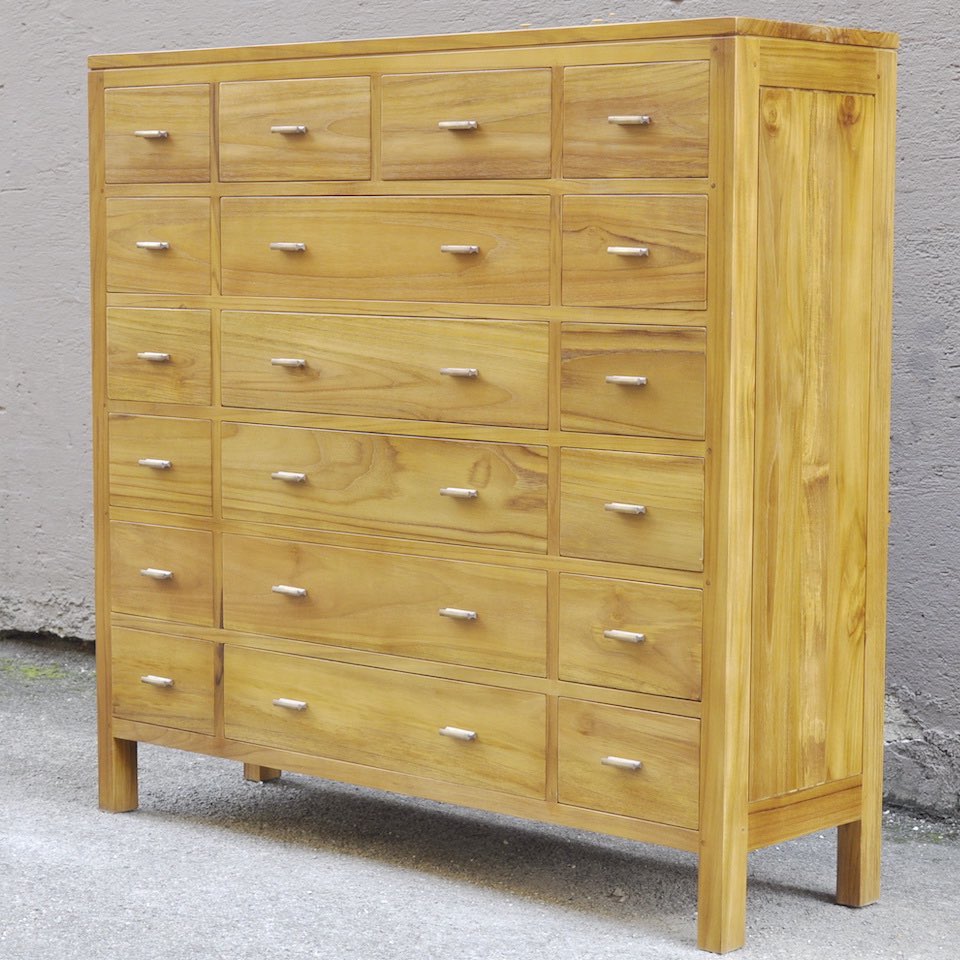 Die massive Teak Kommode TOBOLE ist eine klassische, vielseitig einsetzbare Kommode aus zertifiziertem Plantagenholz. Mit sage und schreibe 19! Schubladen in 3 unterschiedlichen Größen ist dieses Massivholz Möbel der Verstauungskünstler schlechthin. TORBOLE bietet Ihnen mega viel Platz für alle Dinge die in einem Haushalt anfallen. Diese wunderbare Kommode fasziniert durch ihre variablen Einsatzmöglichkeiten. Sowohl im Wohn- und Essbereich, im Unordnung gefährdeten Flur, im urbanen Atelier oder im Schlafzimmer, ja sogar im chaotischen Kinderzimmer, ist unsere stabile Kommode einsatzfähig. Mit einer schönen Tischlampe auf der Ablagefläche wird TORBOLE zum echten Highlight im Wohnambiente.