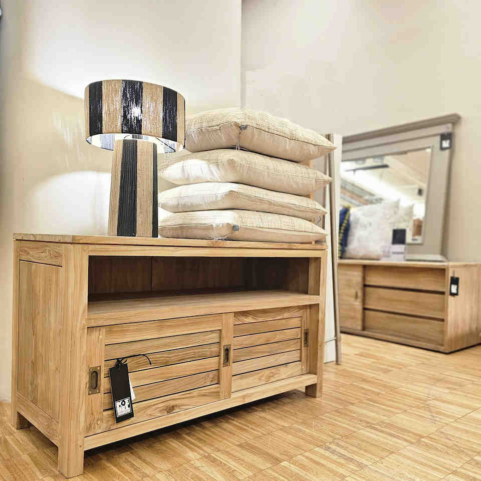 Unser massives TV Board IMPERIA vereint Funktionalität und Design. Mit 2 Schiebetüren und Türfüllungen im modernen Horizontal Design verbreitet IMPERIA im Wohnbereich ein mediterranes und luftiges Flair. Auch das offene Fach im oberen Teil bietet zusätzlichen Stauraum und verleiht dem Lowboard zugleich eine gewisse Lockerheit und Leichtigkeit. IMPERIA verstaut Ihr Multimedia- Equipment elegant und diskret. Unser multifunktionales Möbel aus Massivholz wird von unserem Schreiner auf traditionelle Weise gefertigt und kann daher auch gerne in Ihren individuellen Wunschmaßen geschreinert werden. Auch die Türfüllungen sind selbstverständlich frei wählbar, wobei die abgebildete Variante es erlaubt, im geschlossenen Zustand Ihre Geräte mit der Fernbedienung zu schalten. Unser Teak massiv Lowboard IMPERIA läßt sich auch bestens als Stauraum - Möbel z.B. für Schuhe im Flur umfunktionieren, auch im Schlafzimmer oder im Bad ist IMPERIA immer eine gute Idee. Gerne erhalten Sie auch dieses Board in massiver Bauweise in allen unseren MOEBEL KOLONIE Farben.